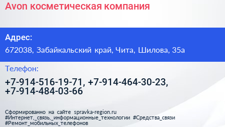 Avon, косметическая компания по адресу 672038, Забайкальский край, Чита, Шилова, 35а в дальнейшем Организация, размещена в следующих категориях:
