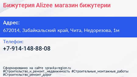 Бижутерия Alizee, магазин бижутерии по адресу 672014, Забайкальский край, Чита, Недорезова, 1м в дальнейшем Организация, размещена в следующих категориях: