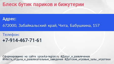 Блеск, бутик париков и бижутерии по адресу 672000, Забайкальский край, Чита, Бабушкина, 157 в дальнейшем Организация, размещена в следующих категориях: