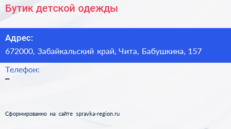 Бутик детской одежды по адресу 672000, Забайкальский край, Чита, Бабушкина, 157 в дальнейшем Организация, размещена в следующих категориях:
