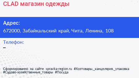 CLAD, магазин одежды по адресу 672000, Забайкальский край, Чита, Ленина, 108 в дальнейшем Организация, размещена в следующих категориях: