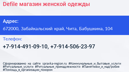 Defile, магазин женской одежды по адресу 672000, Забайкальский край, Чита, Бабушкина, 104 в дальнейшем Организация, размещена в следующих категориях: