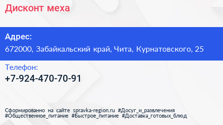 Дисконт меха по адресу 672000, Забайкальский край, Чита, Курнатовского, 25 в дальнейшем Организация, размещена в следующих категориях: