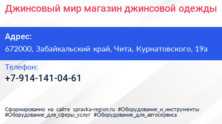 Джинсовый мир, магазин джинсовой одежды по адресу 672000, Забайкальский край, Чита, Курнатовского, 19а в дальнейшем Организация, размещена в следующих категориях: