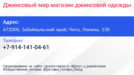 Джинсовый мир, магазин джинсовой одежды по адресу 672000, Забайкальский край, Чита, Ленина, 130 в дальнейшем Организация, размещена в следующих категориях: