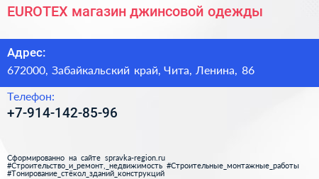 EUROTEX, магазин джинсовой одежды по адресу 672000, Забайкальский край, Чита, Ленина, 86 в дальнейшем Организация, размещена в следующих категориях: