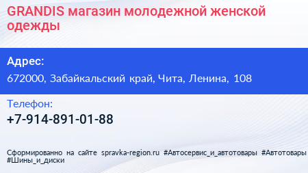 GRANDIS, магазин молодежной женской одежды по адресу 672000, Забайкальский край, Чита, Ленина, 108 в дальнейшем Организация, размещена в следующих категориях: