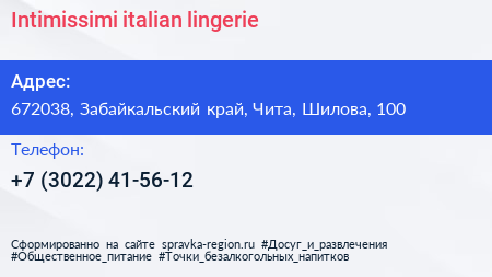 Intimissimi italian lingerie по адресу 672038, Забайкальский край, Чита, Шилова, 100 в дальнейшем Организация, размещена в следующих категориях: