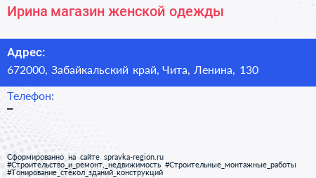 Ирина, магазин женской одежды по адресу 672000, Забайкальский край, Чита, Ленина, 130 в дальнейшем Организация, размещена в следующих категориях: