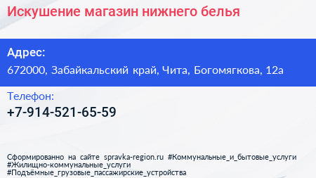 Искушение, магазин нижнего белья по адресу 672000, Забайкальский край, Чита, Богомягкова, 12а в дальнейшем Организация, размещена в следующих категориях: