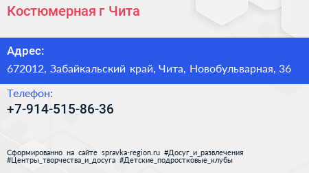 Костюмерная, г. Чита по адресу 672012, Забайкальский край, Чита, Новобульварная, 36 в дальнейшем Организация, размещена в следующих категориях:
