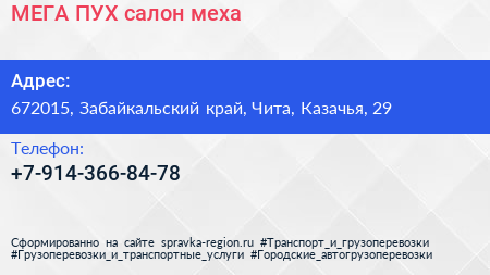 МЕГА ПУХ, салон меха по адресу 672015, Забайкальский край, Чита, Казачья, 29 в дальнейшем Организация, размещена в следующих категориях: