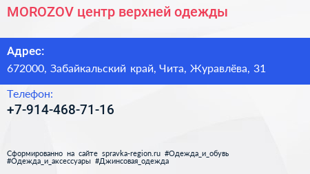 MOROZOV, центр верхней одежды по адресу 672000, Забайкальский край, Чита, Журавлёва, 31 в дальнейшем Организация, размещена в следующих категориях: