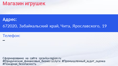 Магазин игрушек по адресу 672020, Забайкальский край, Чита, Ярославского, 19 в дальнейшем Организация, размещена в следующих категориях: