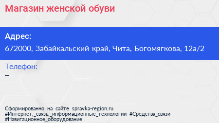 Магазин женской обуви по адресу 672000, Забайкальский край, Чита, Богомягкова, 12а/2 в дальнейшем Организация, размещена в следующих категориях: