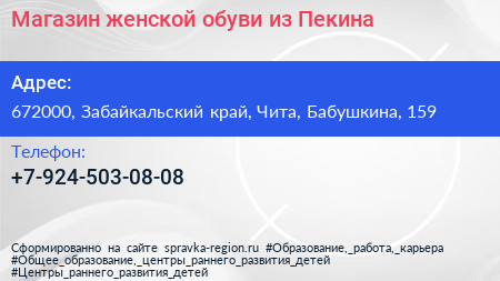 Магазин женской обуви из Пекина по адресу 672000, Забайкальский край, Чита, Бабушкина, 159 в дальнейшем Организация, размещена в следующих категориях: