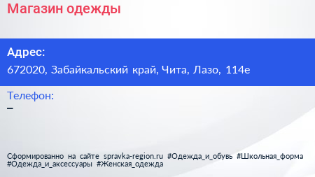 Магазин одежды по адресу 672020, Забайкальский край, Чита, Лазо, 114е в дальнейшем Организация, размещена в следующих категориях: