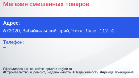 Магазин смешанных товаров по адресу 672020, Забайкальский край, Чита, Лазо, 112 к2 в дальнейшем Организация, размещена в следующих категориях: