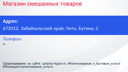 Магазин смешанных товаров по адресу 672012, Забайкальский край, Чита, Бутина, 2 в дальнейшем Организация, размещена в следующих категориях: