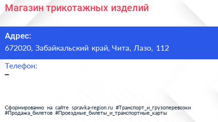 Магазин трикотажных изделий по адресу 672020, Забайкальский край, Чита, Лазо, 112 в дальнейшем Организация, размещена в следующих категориях: