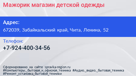 Мажорик, магазин детской одежды по адресу 672039, Забайкальский край, Чита, Ленина, 52 в дальнейшем Организация, размещена в следующих категориях: