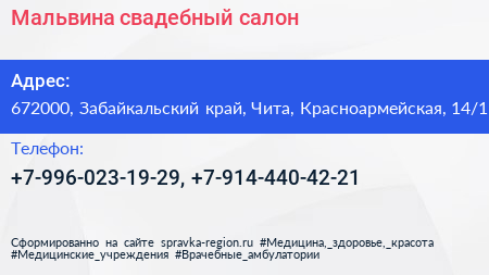 Мальвина, свадебный салон по адресу 672000, Забайкальский край, Чита, Красноармейская, 14/1 в дальнейшем Организация, размещена в следующих категориях: