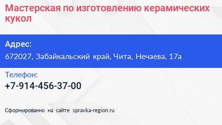 Мастерская по изготовлению керамических кукол по адресу 672027, Забайкальский край, Чита, Нечаева, 17а в дальнейшем Организация, размещена в следующих категориях: