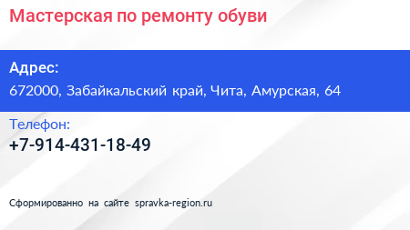 Мастерская по ремонту обуви по адресу 672000, Забайкальский край, Чита, Амурская, 64 в дальнейшем Организация, размещена в следующих категориях: