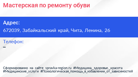 Мастерская по ремонту обуви по адресу 672039, Забайкальский край, Чита, Ленина, 26 в дальнейшем Организация, размещена в следующих категориях:
