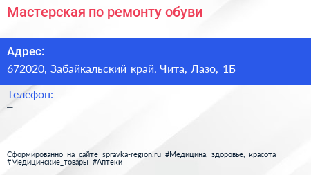 Мастерская по ремонту обуви по адресу 672020, Забайкальский край, Чита, Лазо, 1Б в дальнейшем Организация, размещена в следующих категориях: