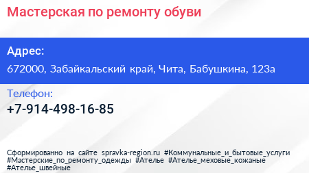 Мастерская по ремонту обуви по адресу 672000, Забайкальский край, Чита, Бабушкина, 123а в дальнейшем Организация, размещена в следующих категориях: