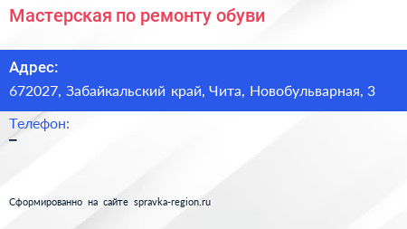 Мастерская по ремонту обуви по адресу 672027, Забайкальский край, Чита, Новобульварная, 3 в дальнейшем Организация, размещена в следующих категориях: