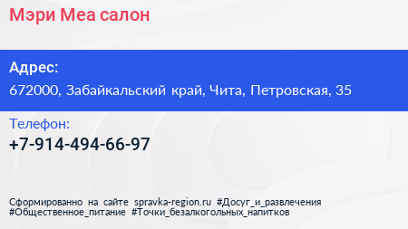 Мэри Меа, салон по адресу 672000, Забайкальский край, Чита, Петровская, 35 в дальнейшем Организация, размещена в следующих категориях: