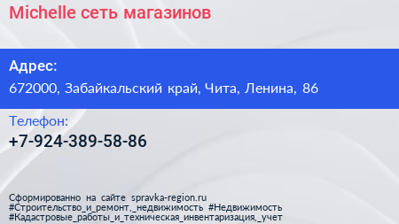 Michelle, сеть магазинов по адресу 672000, Забайкальский край, Чита, Ленина, 86 в дальнейшем Организация, размещена в следующих категориях: