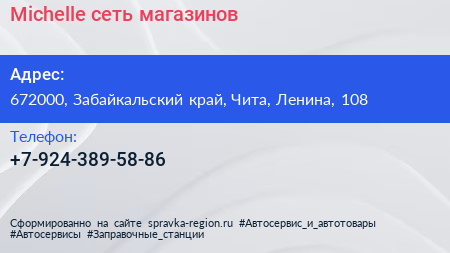 Michelle, сеть магазинов по адресу 672000, Забайкальский край, Чита, Ленина, 108 в дальнейшем Организация, размещена в следующих категориях: