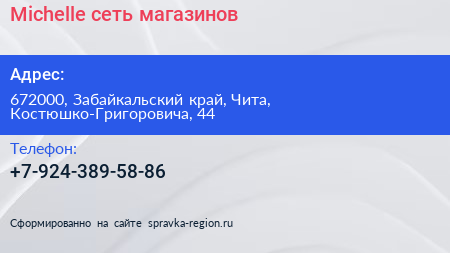 Michelle, сеть магазинов по адресу 672000, Забайкальский край, Чита, Костюшко-Григоровича, 44 в дальнейшем Организация, размещена в следующих категориях: