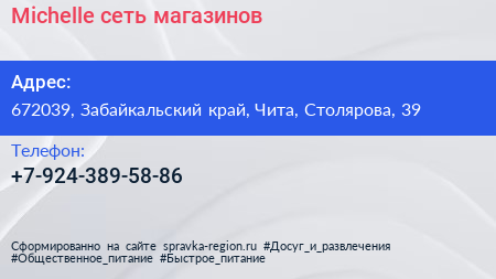 Michelle, сеть магазинов по адресу 672039, Забайкальский край, Чита, Столярова, 39 в дальнейшем Организация, размещена в следующих категориях: