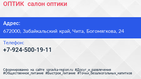 ОПТИК+, салон оптики по адресу 672000, Забайкальский край, Чита, Богомягкова, 24 в дальнейшем Организация, размещена в следующих категориях: