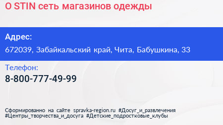 O`STIN, сеть магазинов одежды по адресу 672039, Забайкальский край, Чита, Бабушкина, 33 в дальнейшем Организация, размещена в следующих категориях: