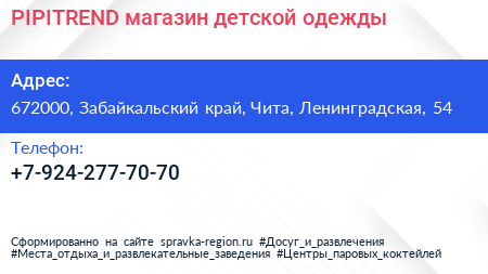 PIPITREND, магазин детской одежды по адресу 672000, Забайкальский край, Чита, Ленинградская, 54 в дальнейшем Организация, размещена в следующих категориях: