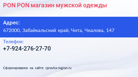 PON-PON, магазин мужской одежды по адресу 672000, Забайкальский край, Чита, Чкалова, 147 в дальнейшем Организация, размещена в следующих категориях:
