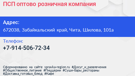 ПСП, оптово-розничная компания по адресу 672038, Забайкальский край, Чита, Шилова, 101а в дальнейшем Организация, размещена в следующих категориях: