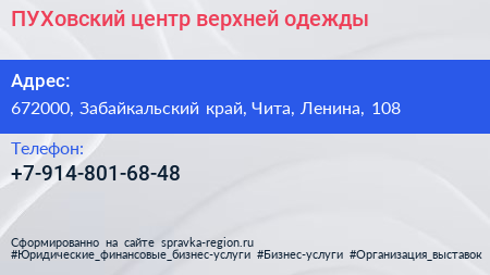 ПУХовский, центр верхней одежды по адресу 672000, Забайкальский край, Чита, Ленина, 108 в дальнейшем Организация, размещена в следующих категориях: