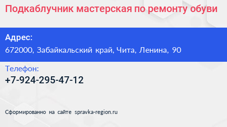 Подкаблучник, мастерская по ремонту обуви по адресу 672000, Забайкальский край, Чита, Ленина, 90 в дальнейшем Организация, размещена в следующих категориях: