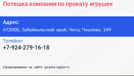 Потешка, компания по прокату игрушек по адресу 672000, Забайкальский край, Чита, Чкалова, 149 в дальнейшем Организация, размещена в следующих категориях: