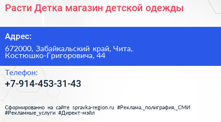 Расти Детка, магазин детской одежды по адресу 672000, Забайкальский край, Чита, Костюшко-Григоровича, 44 в дальнейшем Организация, размещена в следующих категориях: