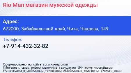 Rio Man, магазин мужской одежды по адресу 672000, Забайкальский край, Чита, Чкалова, 149 в дальнейшем Организация, размещена в следующих категориях:
