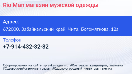 Rio Man, магазин мужской одежды по адресу 672000, Забайкальский край, Чита, Богомягкова, 12а в дальнейшем Организация, размещена в следующих категориях: