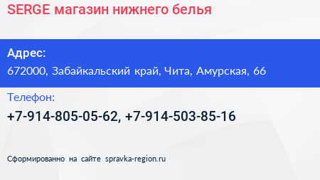 SERGE, магазин нижнего белья по адресу 672000, Забайкальский край, Чита, Амурская, 66 в дальнейшем Организация, размещена в следующих категориях: