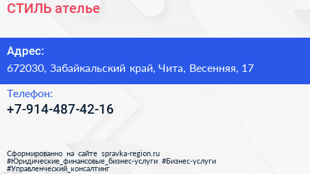 СТИЛЬ, ателье по адресу 672030, Забайкальский край, Чита, Весенняя, 17 в дальнейшем Организация, размещена в следующих категориях: